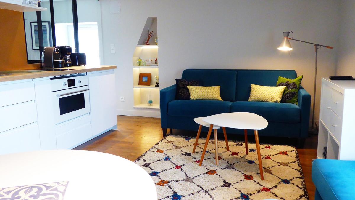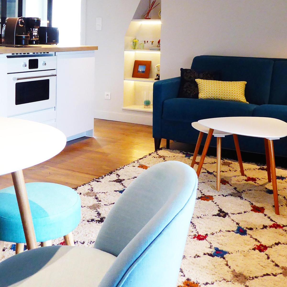 Lors de la dépose, nous avons découvert un magnifique mur en pierre que j’ai absolument souhaité garder et mettre en valeur avec des joints à la chaux. Puis, nous avons découvert un enfoncement dans un des murs que nous avons transformés en petite bibliothèque. L’éclairage indirect sous les étagères apportées de la profondeur et met à la fois en valeur les objets et photos. Nous avons également réussi à restaurer le parquet qui initialement était recouvert d’un lino collé. Que de belles surprises pour ce petit appartement plein de charme !