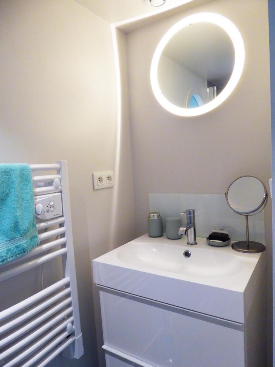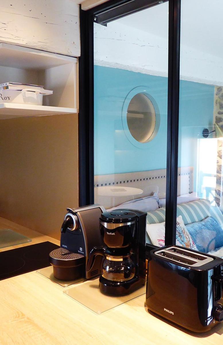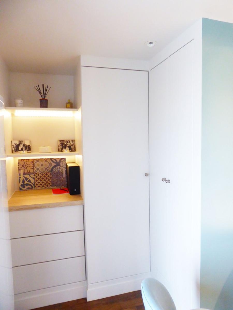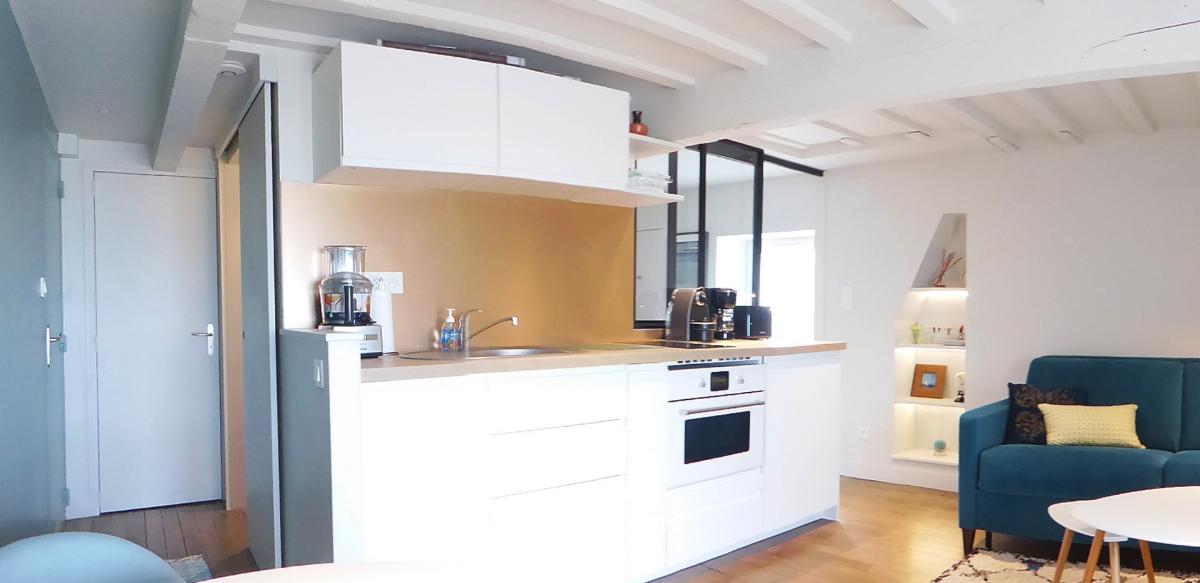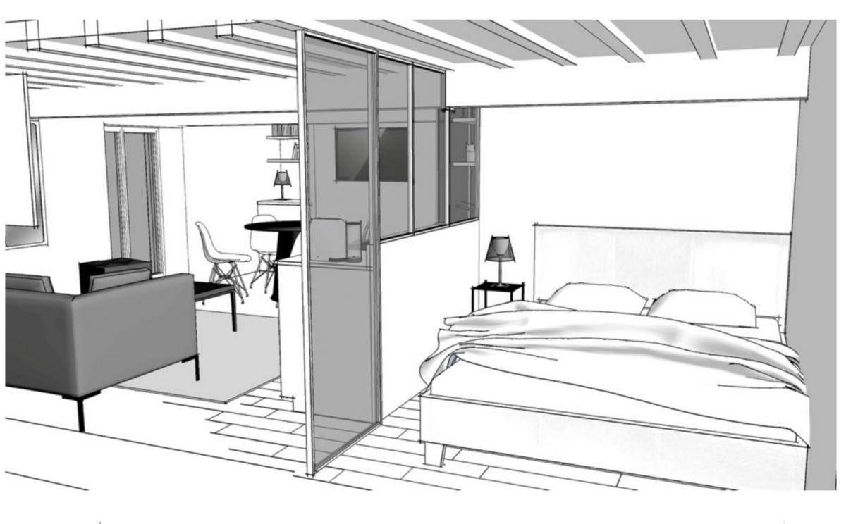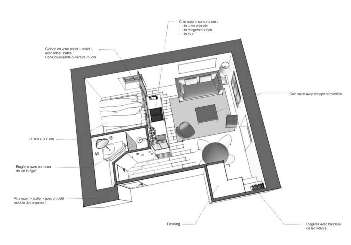 Il est important dans les petits espaces d’optimiser chaque centimètre en travaillant sur les volumes, la circulation, les rangements astucieux, etc. Et afin de donner une impression d’espace, la lumière naturelle et artificielle est la clé de la réussite. Tout comme le choix des coloris sur les murs, sols et plafonds. Dans ce projet, nous avons privilégié les teintes claires et avons travaillé sur des éclairages directs et indirects. Une verrière entre la chambre et le salon permet l’apport de la lumière naturelle et visuellement donne de la profondeur aux espaces.