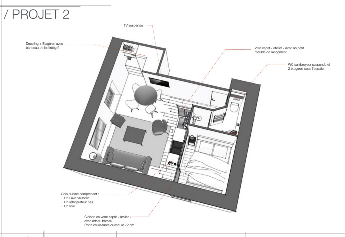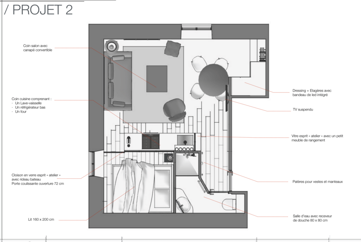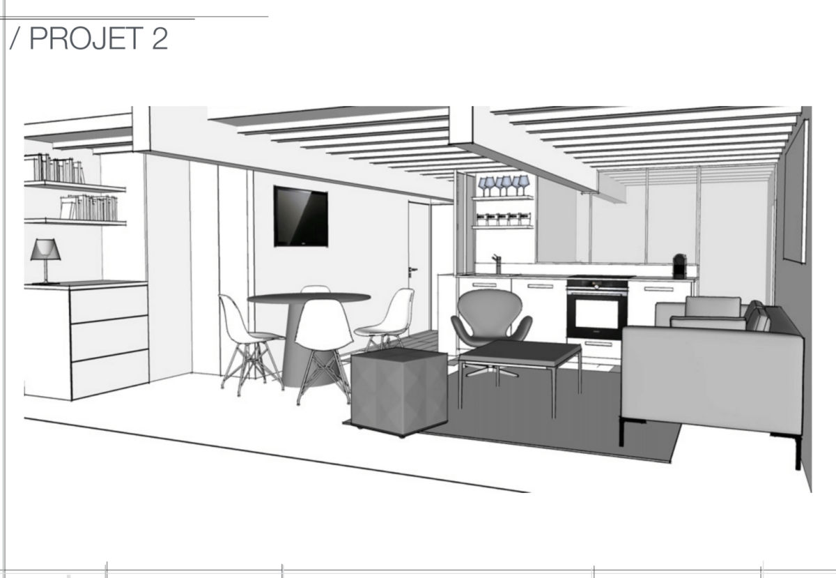 La cliente souhaitait avoir un espace de vie, une cuisine, une salle à manger, une chambre, un WC, une salle d’eau et des rangements. La première mission était donc celle d’étudier et d’optimiser les espaces aux centimètres près. Il a fallu trouver des astuces afin que la circulation soit fluide, des espaces confortables et bien évidemment fonctionnels.