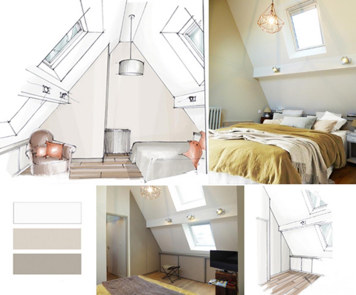Pourtant, la mission s’annonçait très compliquée par le fait de la structure du bâtiment composée des poteaux en béton qui scindaient en 3 parties l’espace des combles déjà très restreint, des volumes biscornus, d’un plancher en béton avec des niveaux différents, etc. Après un sondage des murs et études des plans, nous avons réalisé un projet qui ravit les clients, et nous aussi !