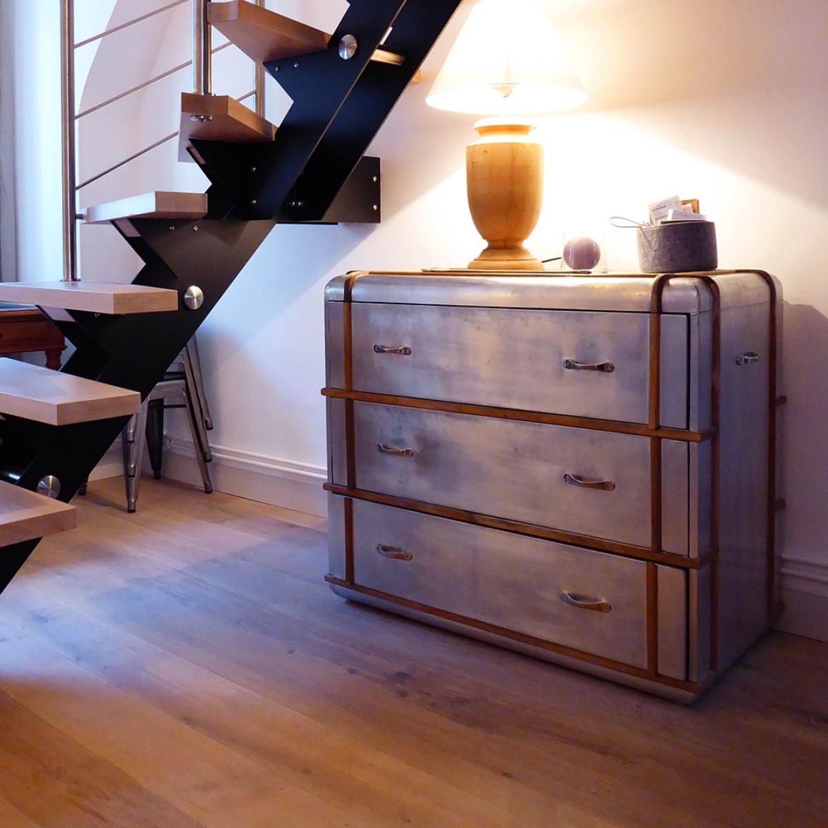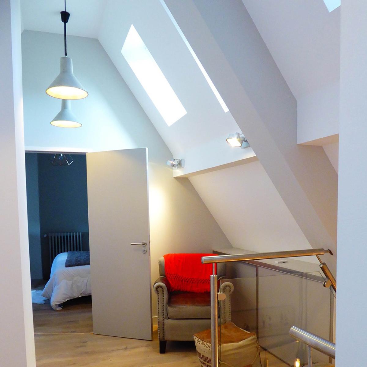 L’ensemble des volumes a été repensé : nous avons créé un bel espace de vie dans l’appartement principal et un espace de nuit dans les combles composé de deux chambres, un WC et une salle d’eau.